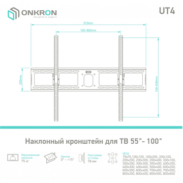 ONKRON UT4 – наклонный кронштейн для телевизора 55"-100". Максимальная нагрузка: 75 кг. Угол наклона: 0° ~ +15°. Вылет от стены: 78 мм.