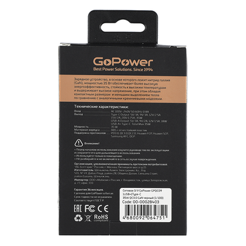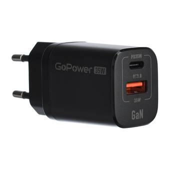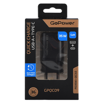 Зарядное устройство GoPower GPQC09 1USB+1Type-C 35W QC3.0 GaN, основанное на технологии нитрида галлия (GaN), обладает мощностью 35 Вт и демонстрирует превосходную энергоэффективность. Оно устойчиво к высоким температурам и напряжению, а также выделяется компактными размерами и минимальным тепловыделением по сравнению с традиционными кремниевыми устройствами.